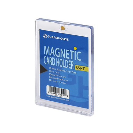 Guardhouse card holders with magnetic closure for storing and displaying your trading card collection. This trading card holder houses a standard-sized 35pt trading card and its clear plastic exterior allows for easy viewing of your cards. Crafted from high-quality, durable materials, this trading card holder features a sleek design and open, rounded corners that keep your card securely in place while protecting the edges from damage. Strong magnets ensure that the holder remains closed and that your card stays safe, protected from dust, moisture, and other elements that can damage them over time. Whether you're a seasoned collector or just starting out, our trading card holder is a handy and convenient way to store and protect your card collection.