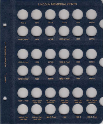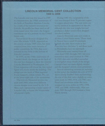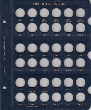 This Whitman Classic Album for Lincoln Cents 1959-2008 (Whitman model number 4958) consists of a dark blue leatherette binder with blue loose-leaf hinged pages.