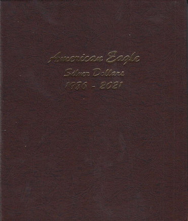 This Dansco Supreme Album for American Eagle Silver Dollars (Dansco model number 7181) consists of a brown leatherette binder with loose-leaf hinged pages.