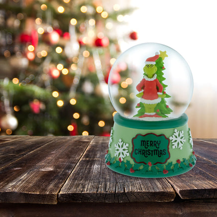 Merry Grinchmas! Any fan of the Grinch will be excited to make this beautifully decorated snow globe part of their holiday decor. Features a classic Grinch scene with a festive resin base. Perfect for any room, everyone will smile when they see this exquisite snow globe on Christmas morning. Surprise friends and family with a cheerful rendition of "Jingle Bells" from the wind up music box. The 100MM green Grinch Snow Globe is perfect for decorating and gift giving. A must have for Grinch fans and collectors.