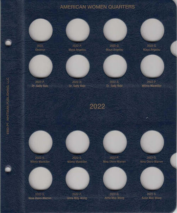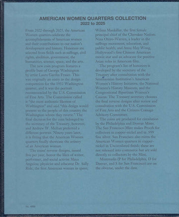 This Whitman Classic Album for American Women Quarters, P&D for 2022-2025 dated Philadelphia and Denver mint coins (Whitman model number 4989) consists of a dark blue leatherette binder with blue loose-leaf hinged pages. Both the binder and pages are gold stamped. The pages are held in the binder with two posts that screw apart so that pages can be added, removed and replaced with ease and have thumb notches for easy window removal. The album has a data sheet with mintages and other historical information.