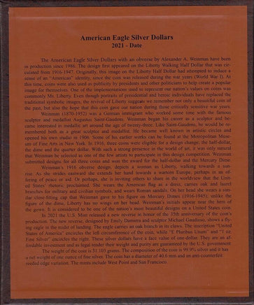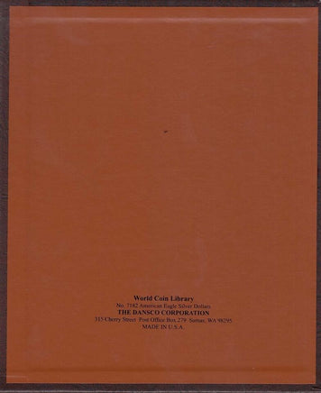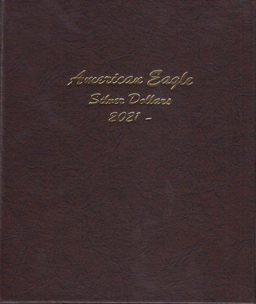 This Dansco Supreme Album for American Eagle Silver Dollars (Dansco model number 7182) consists of a brown leatherette binder with loose-leaf hinged pages.